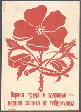 1926 г. Сентябрь. Разм. 42 х 60 мм. Одноцветная печать на белой бумаге различных оттенков. В центре цветок мака с листьями и двумя бутонами и серп и молот. Внизу текст в две строки: «Охрана труда и здоровья – верная защита от туберкулеза». По углам разграничительные линии.