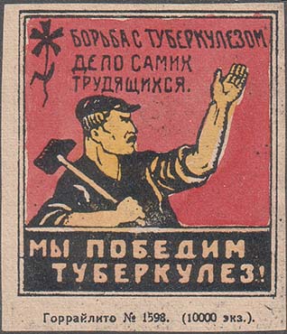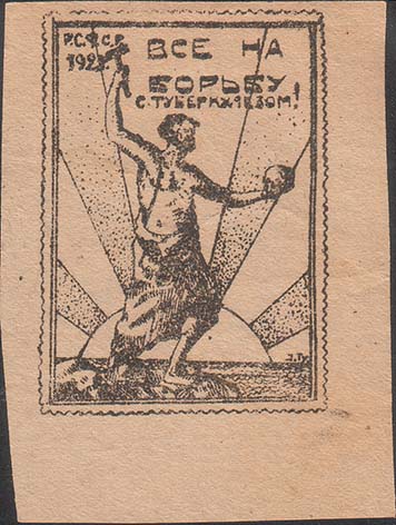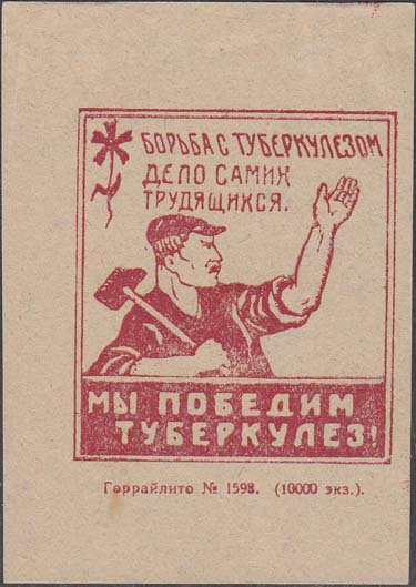 1926 г. Разм. 58 х 76 мм. Одноцветная печать на бумаге различных цветов. В двойной прямоугольной рамке разм. 49 х 54 мм в центре рабочий с молотом и поднятой левой рукой. Сверху текст в три строки: «Борьба с туберкулезом – дело самих трудящихся». В левом верхнем углу стилизованное изображение цве…