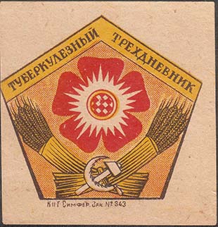 1928(?) г. Прямоугольник разм. 55 х 55 мм. Трехцветная печать на кремовой бумаге. В пятиугольной рамке разм. 50 х 46 мм в центре стилизованное изображение цветка мака в обрамлении венка из колосьев пшеницы. Внизу серп и молот. Сверху по внутренней стороне рамки текст: «Туберкулезный трехдневник».…