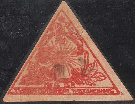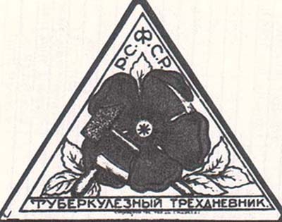 1926(?) г. Треугольник разм. рамки 85 х 66 мм. Одноцветная печать низкого качества на серой бумаге. В центре в треугольной рамке цветок мака, серп и молот. Сверху по внутреннему контуру рамки аббревиатура «Р.С.Ф.С.Р.». Внизу аббревиатура «Кр. С.С.Р.». Внизу текст: «Туберкулезный трехдневник».