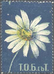 1916(?) г. Разм. по перфорации 30 х 39 мм. Зубц. 11 1/2. Трехцветная печать на белой бумаге. На сплошном синем фоне ромашка. Внизу аббревиатура: «Т.О.Б.с Т.».