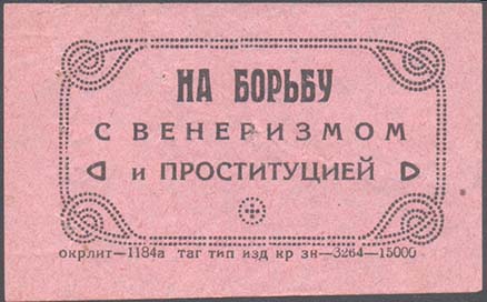 1927 г. 14.-15.09.1927 г. Разм. 72 х 45 мм. Одноцветная печать на тонкой розовой бумаге. В центре в декоративной рамке разм. 59 х 31 мм текст в три строки: «На борьбу с венеризмом и проституцией». Внизу декоративный элемент. Внизу под рамкой выходные данные мелким шрифтом: «Окрлит-1184а Таг. Тип. …