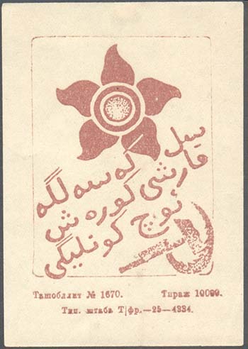 1926 г. Разм. 60 х 82 мм. Одноцветная печать на кремовой бумаге. В прямоугольной рамке с закругленными углами разм. 43 х 57 мм сверху стилизованное изображение цветка мака. Внизу по диагонали текст в три строки на узбекском языке арабским шрифтом. В правом нижнем углу серп и молот. Внизу под рамк…