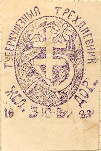 1923 г. 12.-14.05.1923 г. Разм. 35 х 40 мм. Одноцветная печать на желтоватой бумаге. В центре в овальной рамке разм. 18 х 24 мм серп и молот, шестиконечный крест и цветы ромашки. По наружному периметру рамки текст: «Туберкулезный трехдневник на ЗКВ. Ж.Д.» и орнамент из цветов. По периметру текст н…