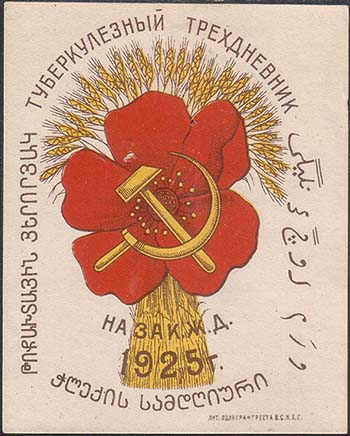 1925 г. Разм. 57 х 71 мм. Трехцветная печать на светло-кремовой бумаге. В центре серп и молот на фоне цветка мака и снопа пшеницы. Сверху полукругом текст: «Туберкулезный трехдневник». По окружности текст на русском, армянском, грузинском и узбекском (арабским шрифтом) языках. На основании снопа …