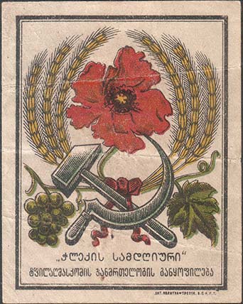 1925 г. 26.06.1925 г. Разм. рамки 50 х 65 мм. Многоцветная печать на белой бумаге. В двойной прямоугольной рамке цветок мака в обрамлении венка из колосьев пшеницы и виноградной лозы. Внизу серп и молот. Ниже текст грузинском языке в две строки». Внизу под рамкой мелким шрифтом выходные данные: «Л…