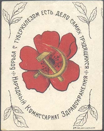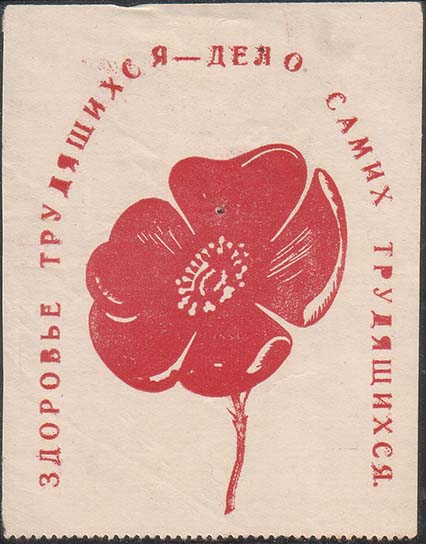 1930(?) г. Разм. 55 х 70 мм. Трехцветная печать на белой бумаге. В центре цветок мака и серп и молот. По окружности текст: «Борьба с туберкулезом есть дело самих трудящихся. Народный Комиссариат Здравоохранения». По углам растительный орнамент. Справа внизу мелким шрифтом выходные данные: «2-я Го…