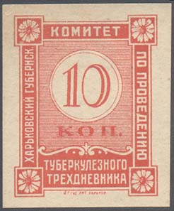 1924 г. Разм. 34 х 43 мм. Одноцветная печать на белой бумаге. В двойной прямоугольной рамке с цветами ромашки по углам круглая рамка с номиналом. По периметру между рамками текст: «Харьковский Губернск[ий]. Комитет по проведению туберкулезного трехдневника». Внизу под рамкой мелким шрифтом выходн…
