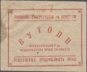 1930(?) г. Разм. 62 х 51 мм. Одноцветная печать на бумаге различных цветов и качества. В прямоугольной рамке в центре аббревиатура на украинском языке «ВУООТБ». Сверху текст на украинском языке: «Победим туберкулез и венеризм». Ниже текст в две строки на украинском языке: «Всеукраинское общество …