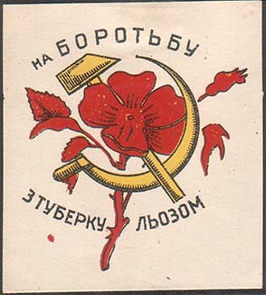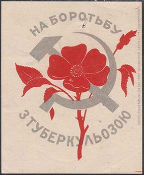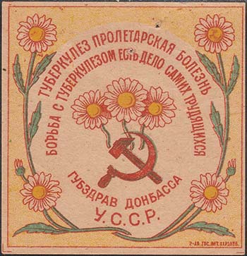 1930(?) г. Разм. рамки 58 х 59 мм. Трехцветная печать на желтоватой бумаге. В центре в обрамлении венка из цветов ромашки серп и молот и три цветка ромашки. Сверху полукругом текст в две строки: «Туберкулез пролетарская болезнь. Борьба с туберкулезом есть дело самих трудящихся». Внизу полукругом …