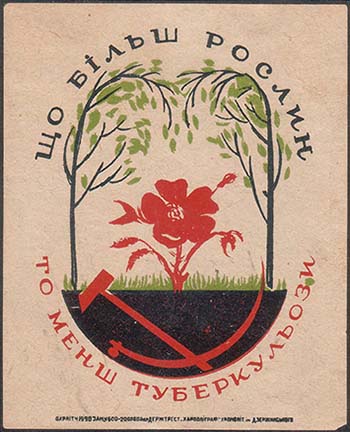 1930 г. Трехцветная печать на кремовой бумаге. В центре в стилизованной рамке из деревьев цветок мака и трава. Внизу скрещенные серп и молот. Сверху полукругом текст на украинском языке: «Чем больше растений». Внизу продолжение текста: «Тем меньше туберкулеза». Внизу мелким шрифтом выходные данны…