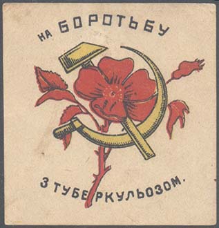 1930(?) г. Разм. 52 х 54 мм. Трехцветная печать на кремовой бумаге. В центре цветок мака и серп и молот. Сверху полукругом текст на украинском языке: «На борьбу». Внизу полукругом продолжение текста на украинском языке: «С туберкулезом».