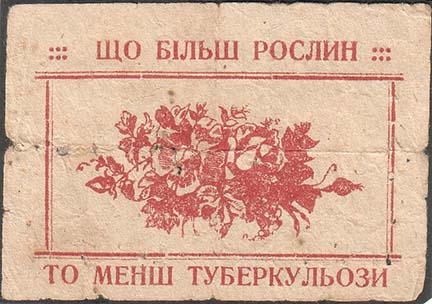 1930(?) г. Разм. 72 х 50 мм. Одноцветная печать на желтоватой бумаге. В двойной прямоугольной рамке разм. 31 х 57 мм куст цветущего шиповника. Сверху над рамкой текст на украинском языке: «Чем больше растений». Внизу под рамкой продолжение текста на украинском языке: «Тем меньше туберкулеза».
