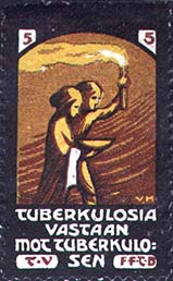 1910 г. Разм. 26 х 42 мм. Многоцветная печать на сероватой белой бумаге. Зубц. 11 1/2. С клеем. Аллегорический сюжет. В центре две женских фигуры с чашей и факелом. Ниже текст на финском языке в четыре строки. Сверху по углам номинал.