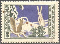 1912 г. Разм. рамки 34,5 х 22,5 мм. Трехцветная печать на белой бумаге. Зубц. 11 1/2. С клеем. Белка и заяц в зимнем лесу. Слева и справа вертикально тексты на финском и других сканди-навских языках: «Счастливого Рождества». В левом верхнем углу номинал.