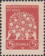 1908 г. Разм. рис. 18 х 24,5 мм. Одноцветная печать на белой бумаге. Зубц. 11 1/2. С клеем. Две пары рук, протянутые к дереву с плодами. Сверху текст в две строки на финском языке.
