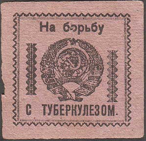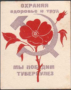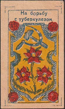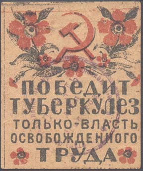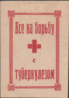 1930(?) г. Разм. 48 х 58 мм. Двухцветная печать на тол-стой рыхлой желтоватой бумаге. Сверху серп и молот в обрамлении венка из цветов мака. Внизу текст в пять строк: «Победит туберкулез только власть освобожденного труда». Внизу по углам цветы мака. Внизу мелким шрифтом выходные данные неразборч…