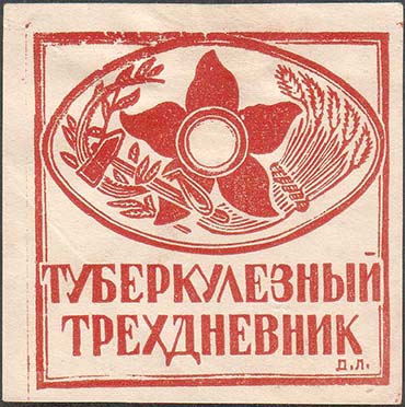 1926(?) г. Разм. рамки 55 х 55 мм. Одноцветная печать на белой бумаге. Сверху в двойной овальной рамке цветок мака в обрамлении снопа серпа и молота и оливковой ветви. Внизу текст в две строки: «Туберкулезный трехдневник». В правом нижнем углу буквы «Д.Л.».