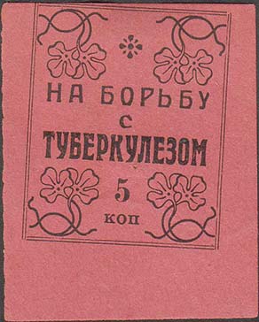 1928(?) г. Разм. 50 х 60 мм. Одноцветная печать на крас-но-карминовой бумаге. В двойной прямоугольной рамке разм. 37 х 45 мм в центре текст в три строки: «На борьбу с туберкулезом». Сверху декоративный элемент. Внизу номинал в две строки: «5 коп.». По углам стилизованное изображение цветов.