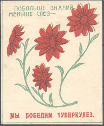1928(?) г. Разм. 60 х 70 мм. Двухцветная печать на белой бумаге. В тонкой прямоугольной рамке разм. 56 х 67 мм ветка с четырьмя цветками. Сверху текст в две строки: «Больше знаний меньше слез -». Внизу продолжение текста: «Мы победим туберкулез».