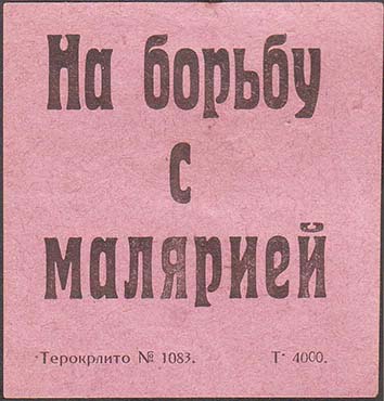 1930(?) г. Разм. 58 х 62 мм. Одноцветная печать на розовой гладкой бумаге. В центре текст в три строки: «На борьбу с малярией». Внизу мелким шрифтом выходные данные: «Терокрлито №1083 т. 4000».