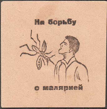 1930(?) г. Разм. 67 х 67 мм. Одноцветная печать на светло-желто-оранжевой бумаге. В центре комар и человек. Текст в две строки: «На борьбу с малярией».