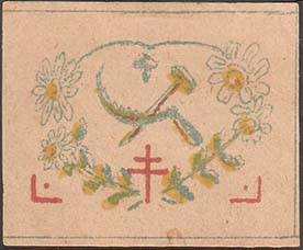 1930(?) г. Разм. 48 х 38 мм. Трехцветная печать на плотной кремовой бумаге. В тонкой прямоугольной рамке разм. 46 х 34,5 мм в центре шестиконечный крест и серп и молот в обрамлении венка из ромашек.