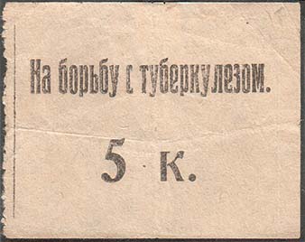 0(?) г. Листок из квитанционной книжки разм. 56 х 44 мм. Одноцветная печать на белой бумаге. Левосторонняя нерегулярная зубц. Сверху текст: «На борьбу с туберкулезом». Ниже номинал. Слева вертикальная линия.