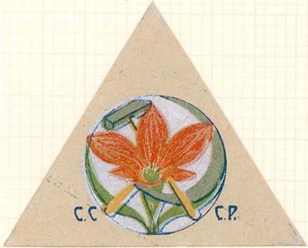 1930(?) г. Треугольник разм. 74 х 59 мм. Многоцветная печать на сероватой бумаге. В центре в круглой рамке диаметром 34 мм стилизованное изображение цветка мака и скрещенные серп и молот. Внизу под рамкой аббревиатура «С.С.С.Р.».