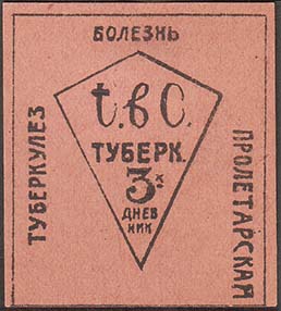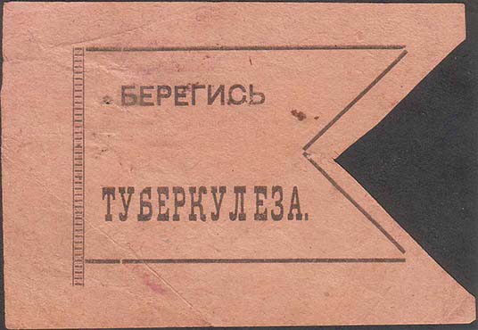 1930(?) г. Разм. 42 х 48 мм. Одноцветная печать на серо-розовой бумаге. В центре в прямоугольной рамке разм. 39 х 45 мм в центре дополнительная ромбовидная рамка. В ромбовидной рамке медицинское обозначение туберкулеза – латинские буквы «T.bc.». Ниже текст в четыре строки: «Туберк[улезный]. 3-х д…