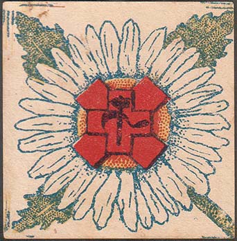 1930(?) г. Разм. 57 х 57 мм. Многоцветная печать на белой бумаге. В центре цветок ромашки с тремя листьями и стеблем. В центре цветка два красных креста и серп и молот.