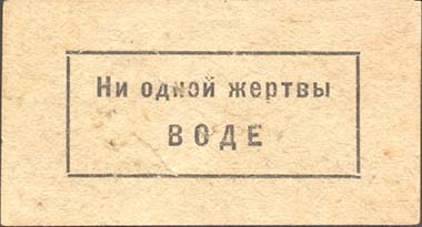 1931(?) г. Разм. 63 х 35 мм. Одноцветная печать на желтоватой бумаге. В прямоугольной рамке разм. 45 х 19 мм текст в две строки: «Ни одной жертвы воде».