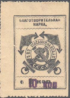 1931(?) г. Разм. рамки 29 х 41,5 мм. Одноцветная печать на желтоватой бумаге. Нерегулярная зубц. В прямоугольной рамке в центре эмблема ОСВОД. Сверху текст в две строки: «Благотворительная марка». Внизу номинал. Поверх старого номинала черная надпечатка нового номинала в виде текста: "10 коп".