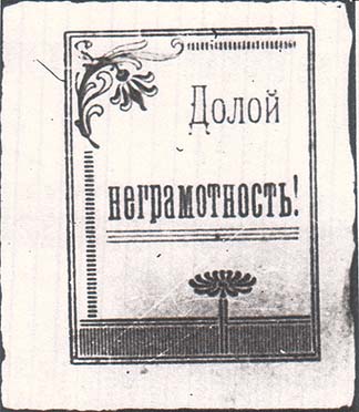 1925(?) г. Разм. 54 х 62 мм. Одноцветная печать на бумаге различных цветов. В двойной прямоугольной рамке разм. 39 х 51 мм с декоративными элементами в виде цветов в центре текст в две строки: «Долой неграмотность!».