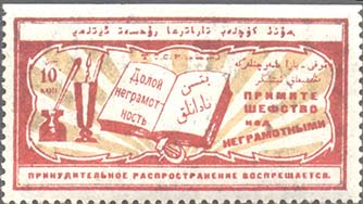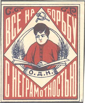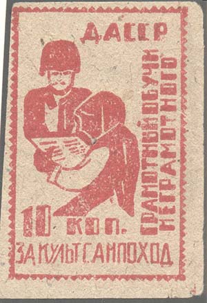 1932(?) г. Разм. 50 х 60 мм. Двухцветная печать на белой бумаге. В двойной прямоугольной рамке разм. 47 х 58 мм значок ОДН. Сверху аббревиатура «С.С.С.Р.». Текст в две строки: «Все на борьбу с неграмотностью».