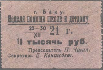 1921 г. 23.-30.12.1921 г. Разм. по перфорации 51 х 37 мм. Одноцветная печать на тонкой бумаге различных цветов. Зубц. 11 1/2. В центре текст в шесть строк: «Г. Баку. Неделя помощи школе и детдому 23-30/XII 21 г. ... тысячи руб. Председатель П.Чагин. Секретарь Е.Кенигсберг».