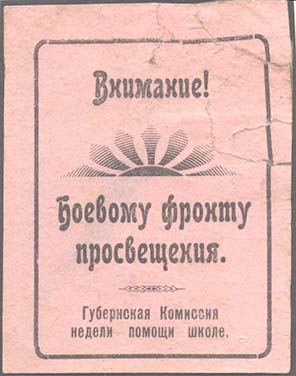 1921 г. Разм. 51 х 65 мм. Одноцветная печать на бумаге различных цветов. В рамке разм. 41 х 59 мм с закругленными краями в центре декоративный элемент. Сверху и снизу различные тексты. Внизу текст в две строки: «Губернская Комиссия недели помощи школе».