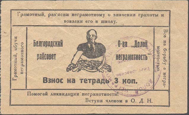 1925(?) г. Разм. 57 х 66 мм. Одноцветная печать на розовой бумаге. В декоративной рамке с растительными элементами текст в две строки: «Долой неграмотность!».