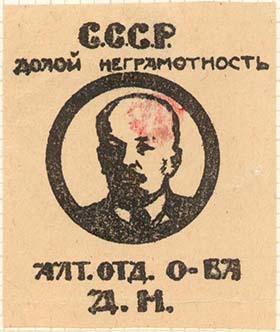 1930(?) г. Разм. 46 х 57 мм. Одноцветная печать на кремо-вой бумаге. В центре в круглой рамке диаметром 29 мм портрет В.И.Ленина. Сверху текст в две строки: «С.С.С.Р. долой неграмотность!». Внизу текст в две строки: «Алт[айский]. Отд[ел]. о-ва Д[олой]. Н[еграмотность].».