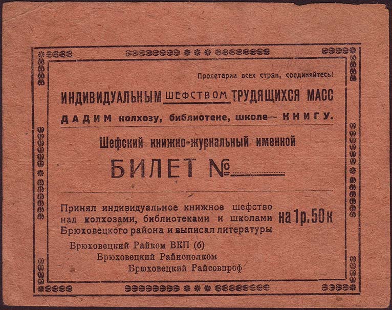 1932(?) г. Листок разм. 128 х 100 мм. Одноцветная печать на желто-коричневой бумаге низкого качества. В двойной прямоугольной рамке разм. 108 х 82 мм в центре текст в две строки: «Шефский книжно-журнальный именной билет №... ». Сверху текст в три строки: «Пролетарии всех стран, соединяйтесь! Инди…