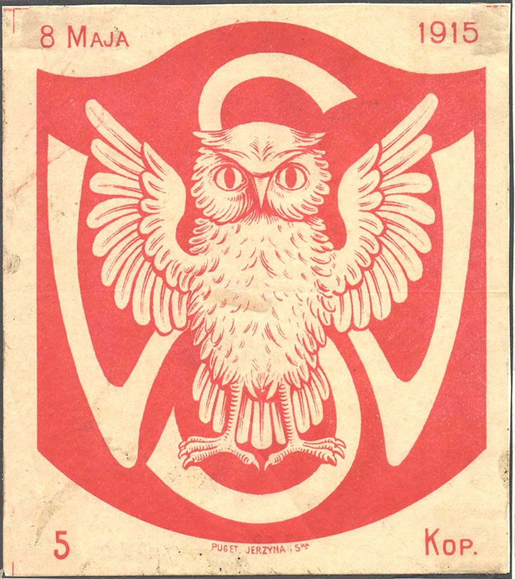 1915 г. 08.05.1915 г. Одноцветная печать на тонкой светло-желто-коричневой полупрозрачной бумаге. В центре сова на фоне латинских букв «S» и «W». Внизу номинал. Сбор в пользу польских школ.