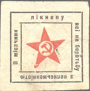 1931 г. Разм. 51 х 51 мм. Двухцветная печать на кремовой бумаге. В центре в двойной прямоугольной рамке разм. 41 х 40 мм пятиконечная звезда с серпом и молотом в центре. По периметру между рамками текст на украинском языке: «В месячник ликбеза все на борьбу с неграмотностью».