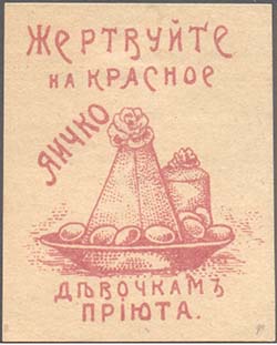 1915(?) г. Разм. 41 х 51 мм. Одноцветная печать на желтоватой бумаге. В центре на тарелке кулич, пасха и пасхальные яйца. Сверху текст в три строки: «Жертвуйте на красное яичко». Внизу продолжение текста в две строки: «Девочкам приюта».