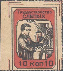1927(?) г. Разм. рамки 25 х 35 мм. Двухцветная печать на желтоватой бумаге на оборотной стороне топографических карт. Зубц. 11 1/2. В двойной прямоугольной рамке слепой рабочий у станка. Сверху текст в две строки: «Трудоустройство слепых». Внизу номинал. Справа внизу под рамкой мелким шрифтом вых…