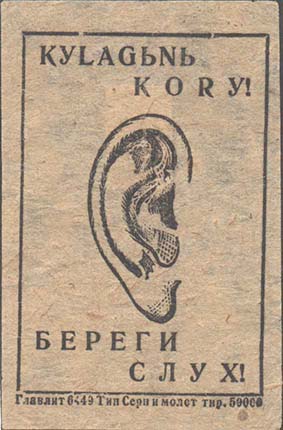 1925(?) г. Разм. рамки 48 х 73 мм. Одноцветная печать на серо-коричневой бумаге низкого качества. В прямоугольной рамке в центре изображение уха человека. Сверху текст в две строки на азербайджанском языке латинской графикой. Внизу текст в две строки: «Берегите слух». Внизу под рамкой мелким шриф…