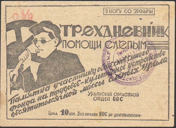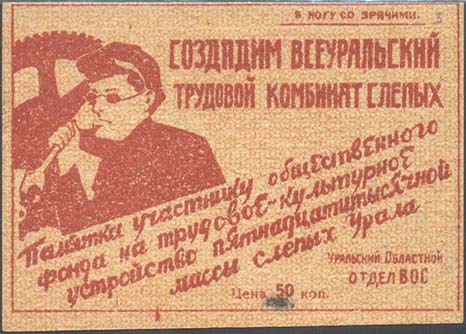 1932 г. Областной выпуск. Одноцветная двухсторонняя печать на толстой бумаге низкого качества различных цветов. На лицевой стороне в рамке разм. 75 х 52 мм слева слепой рабочий с гаечным ключом на фоне заводского оборудования. Текст: «В ногу со зрячими. Создадим всеуральский трудовой комбинат слеп…