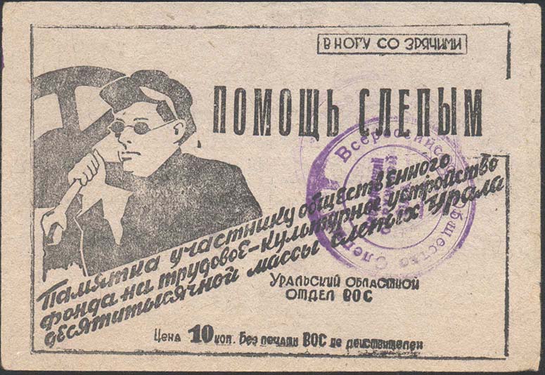 1931 г. Двухцветная двухсторонняя печать на плотной желтоватой бумаге. На лицевой стороне в рамке разм. 75 х 52 мм слева слепой рабочий с гаечным ключом на фоне заводского оборудования. Текст: «В ногу со зрячими. Создадим Всеуральский Трудовой комбинат слепых слепым. Памятка участнику общественно…