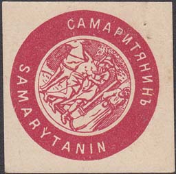 1915(?) г. Ромб разм. 60 х 60 мм. Одноцветная печать на белой бумаге. В центре толстой круглой рамке разм. 37 мм иллюстрация библейского сюжета о добром Самаритянине. По периметру на сплошном фоне текст на русском языке и на латыни(?): "Самаритянин".