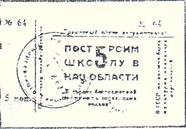 1931 г. Листок из квитанционной книжки разм. ≈ 89 х 60 мм. Одноцветная печать на бумаге различных цветов. В центре номинал и текст в три строки: «Построим школу в нацобласти». Сверху номер и текст с подчеркиванием: «Грамотный, обучи неграмотного». Внизу текст в четыре строки: ««В стране безграмот…