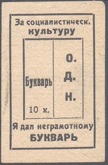 1933 г. Разм. 34 х 54 мм. Одноцветная печать на толстой белой бумаге. В центре в двойной прямоугольной рамке разм. 28 х 45 слева текст: «Букварь». Ниже номинал. Справа вертикально аббревиатура «О.Д.Н.». Между рамками сверху текст в две строки: «За социалистическ[ую]. культуру». Внизу между рамкам…